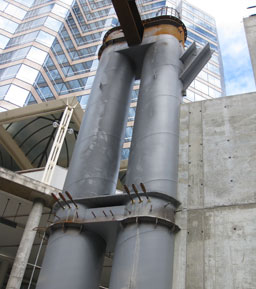- Full profiling of the circular column shafts was achieved with a robotic pipe profiler using 3D DXF data from the BOCAD 3D model, including slots for cleats, weld preps and holes for slab reinforcement